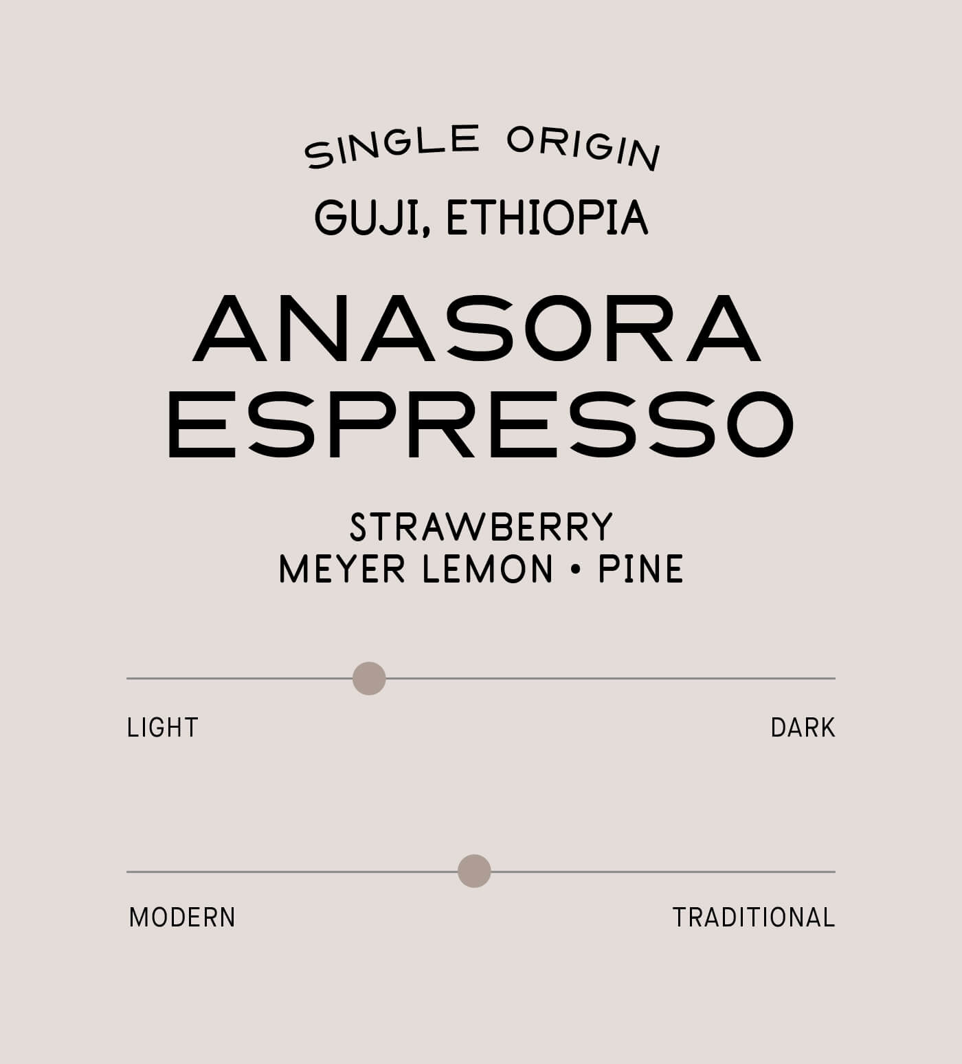 Designed with espresso in mind, this natural lot from Guji Anasora balances aromatic intensity with control. High elevation, careful cherry selection, and extended drying enhance fruit sweetness and body, while the cool highland climate preserves acidity and definition. Strawberry and Meyer Lemon notes remain clear in the cup, with a subtle pine-like character adding complexity without overwhelming the palate. The result is an expressive espresso built for consistency and repeatability, whether enjoyed straight or with milk.