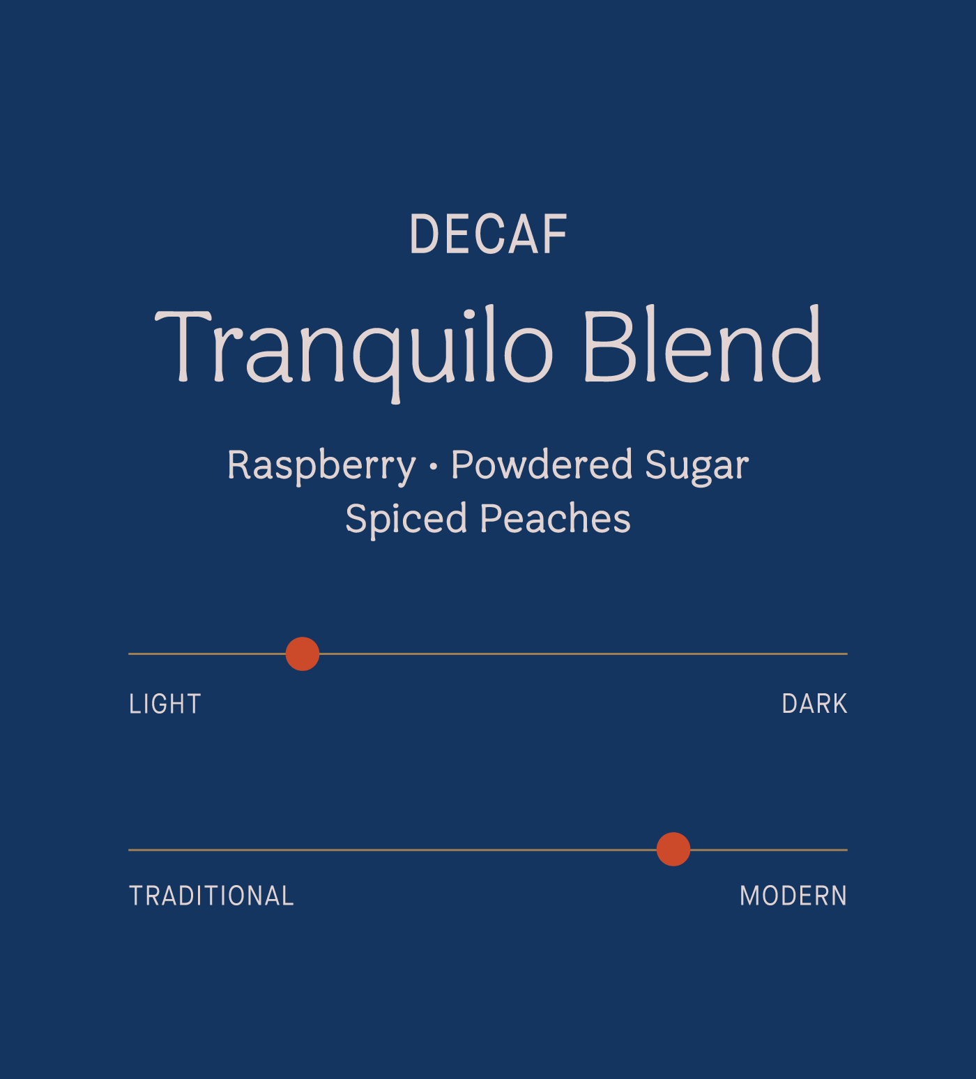 Decaffeinated through the Sugar Cane process at Descafecol, Tranquilo preserves the nuanced sweetness and aromatic integrity of its origins. It’s an elevated decaf crafted for ritual, reflection, and the quiet constant of coffee at life’s best moments.