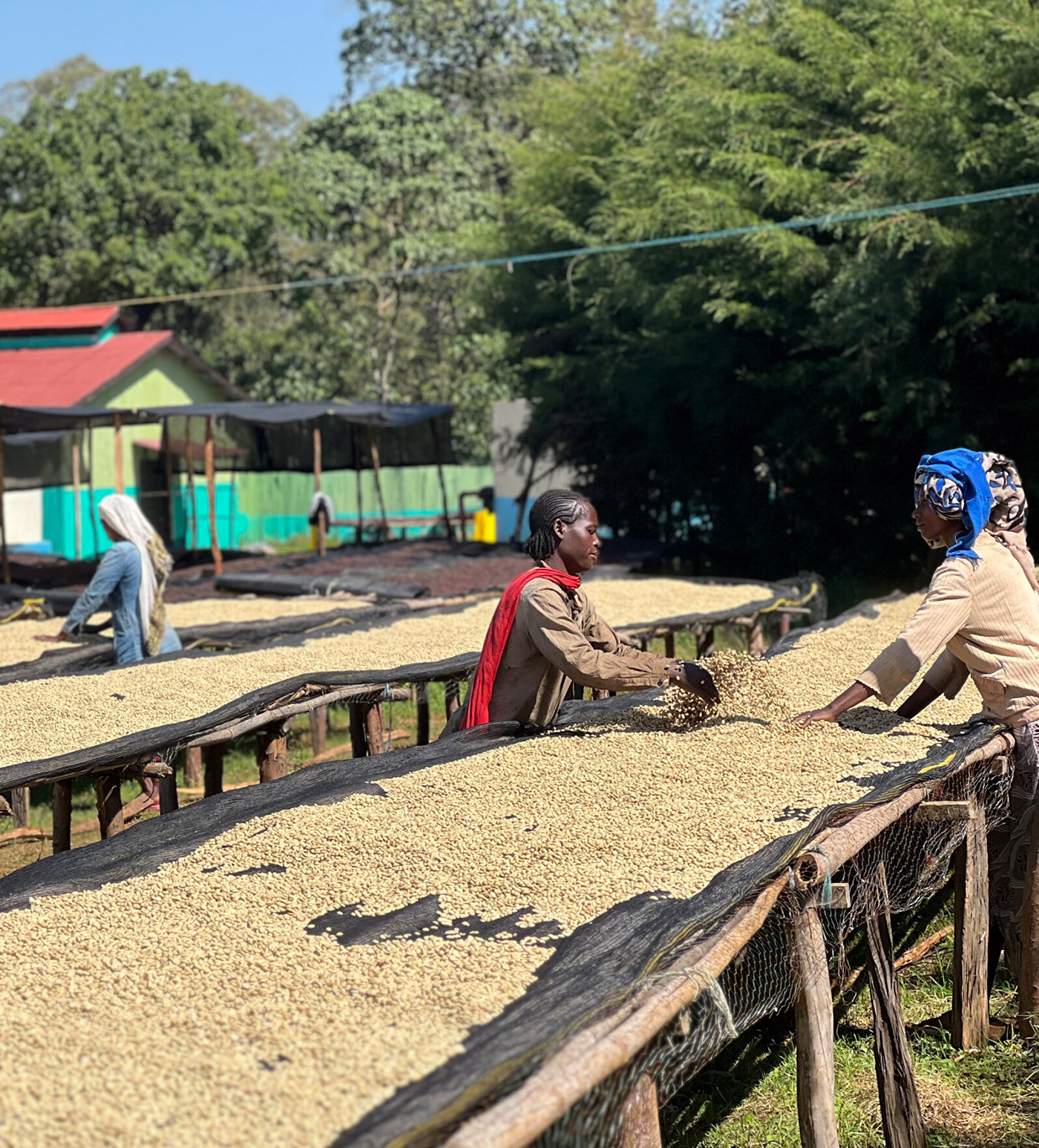 Reaching Idido requires determination. After flying from Addis Ababa to Hawassa, it takes hours of driving and dirt-road travel to reach the washing station, with farms scattered across steep, mountainous terrain. During harvest, cherries are carried by motorcycle, horse, or donkey, sometimes through muddy, impassable roads during the rainy season. Despite these challenges, farmers deliver ripe cherries that undergo careful sorting, pulping, and fermentation before drying slowly on raised beds.